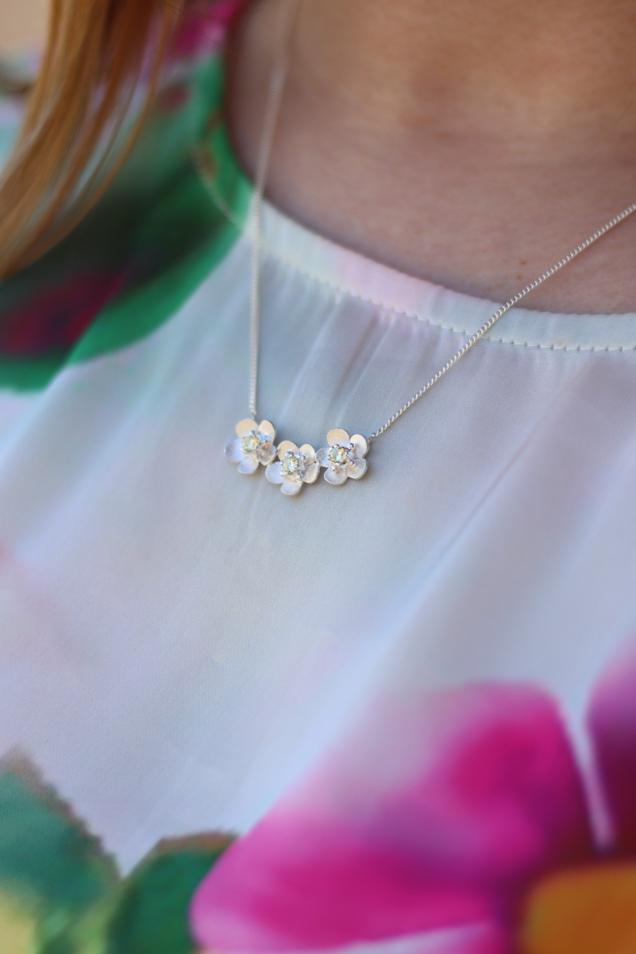 Hopeinen pihlajankukka kaulakoru. Jokaisen kukan keskeltä löytyy hailakan sitruunankeltaiset cubic zirconiat. Materiaaliltaan koru on 925 hopeaa.