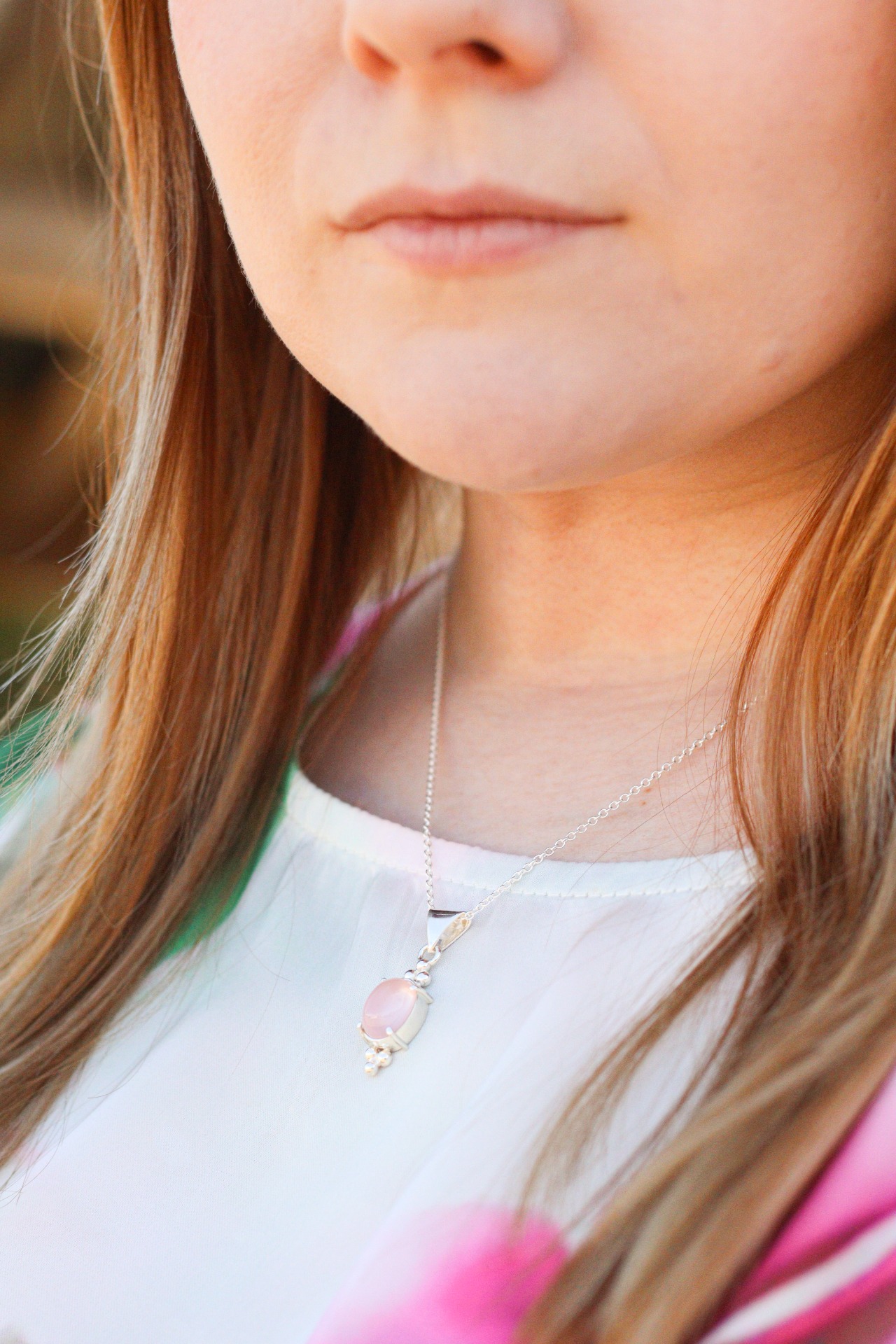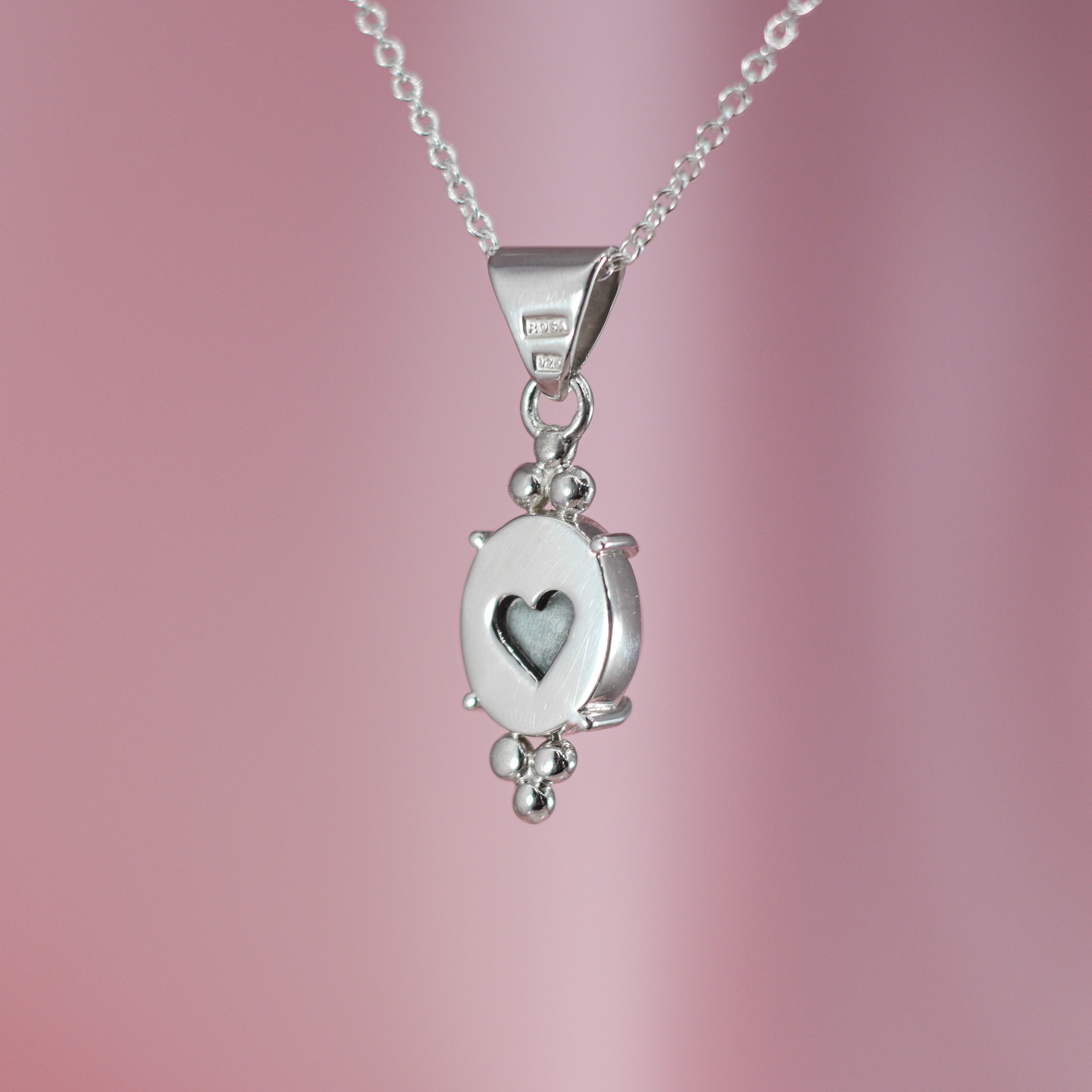 Pieni riipus ruusukvartsilla. Takapuolella patinoitu sydän.